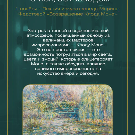 Новости 07.10.2025 ЗАВТРАК С ИСКУССТВОВЕДОМ 01.11.2025 в 11:00.Завтрак с искусствоведом Мариной Федотовой"ВОЗВРАЩЕНИЕ КЛОДА МОНЕ" Во время завтрака Читать далее ЗАВТРАК С ИСКУССТВОВЕДОМ